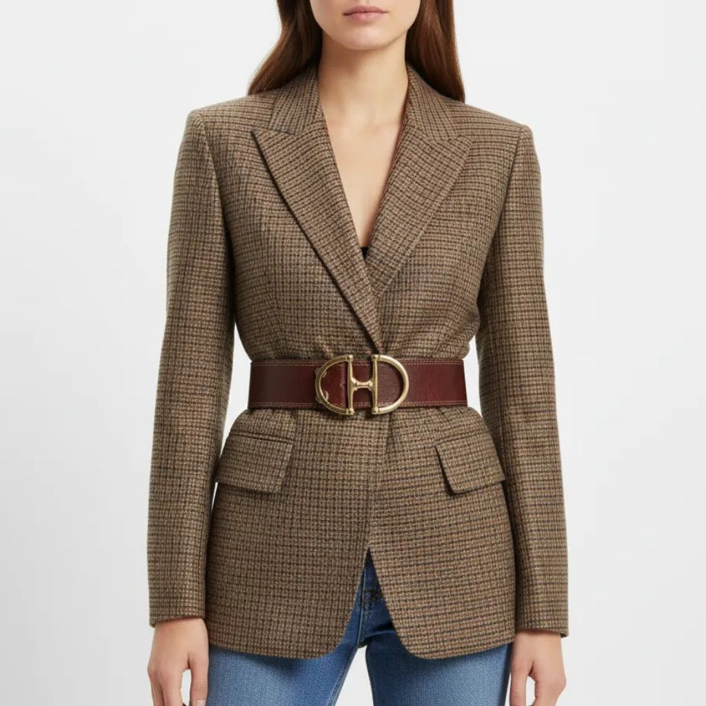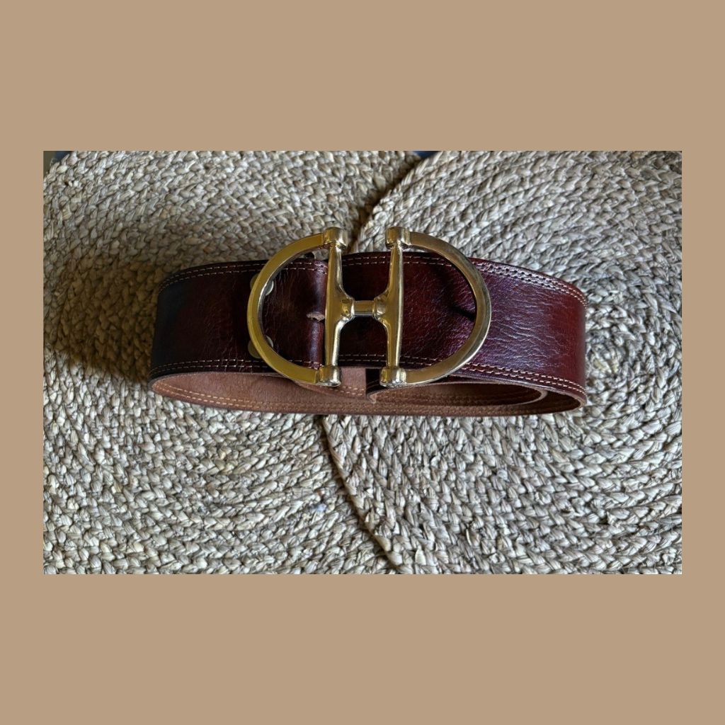Este cinturón de piel marrón destaca por su diseño elegante y su icónica hebilla dorada en forma de bocado ecuestre, un detalle clásico asociado al estilo sofisticado y atemporal. Fabricado en cuero auténtico de alta calidad, su tacto suave y su estructura firme lo convierten en una pieza imprescindible para elevar cualquier look.