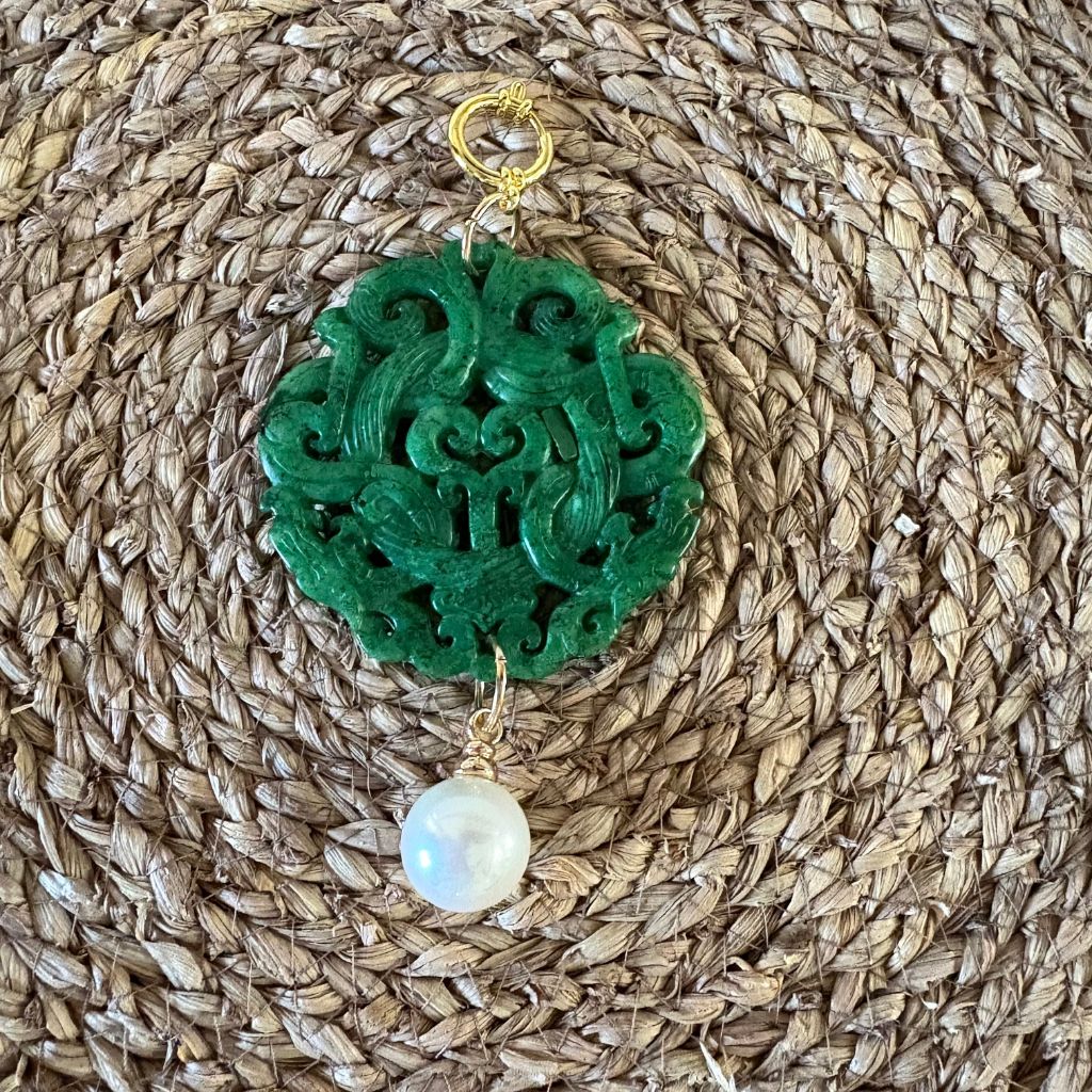 Colgante creado a mano por Keka, formado por un medallón tallado en tono verde con diseño calado y una perla blanca colgante que aporta luz y equilibrio. El broche dorado ha sido montado artesanalmente, pensado para usar como colgante intercambiable en distintos collares.