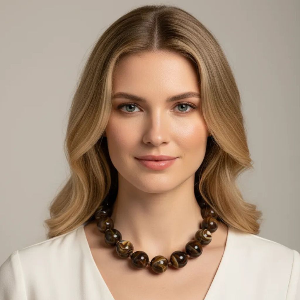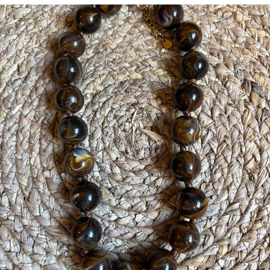 El collar de bolas marmoleadas en tono marrón es una pieza que combina la calidez de los tonos tierra con el encanto artesanal de las vetas naturales.