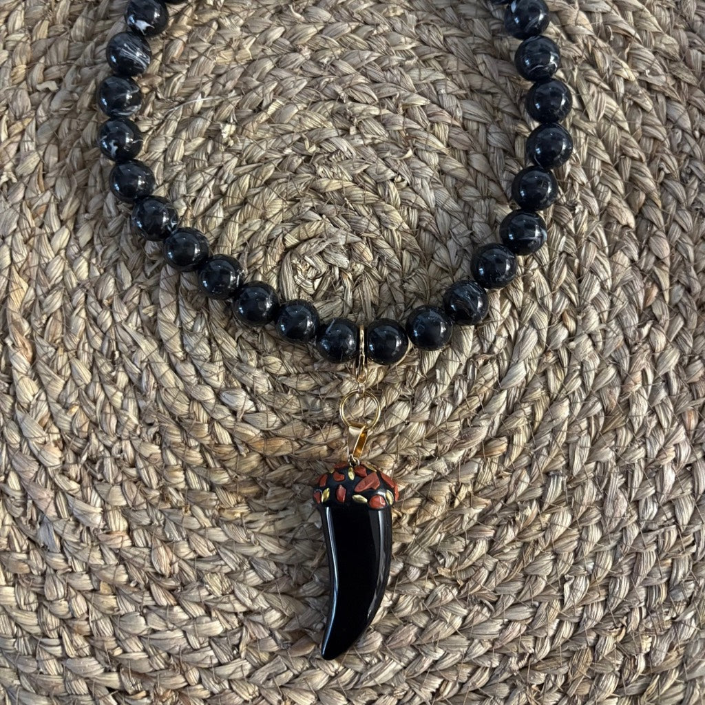 Un clásico reinventado con un toque artístico. Nuestro Collar de Cuentas Esféricas destaca por su sutil efecto jaspeado en tonos negros y grises, imitando la profundidad de las piedras naturales. Sus cuentas perfectamente redondas y pulidas crean una silueta armoniosa y atemporal. Gracias a su cierre ajustable, es el complemento ideal tanto para cuellos de camisa como para escotes abiertos, aportando una sofisticación inmediata.
