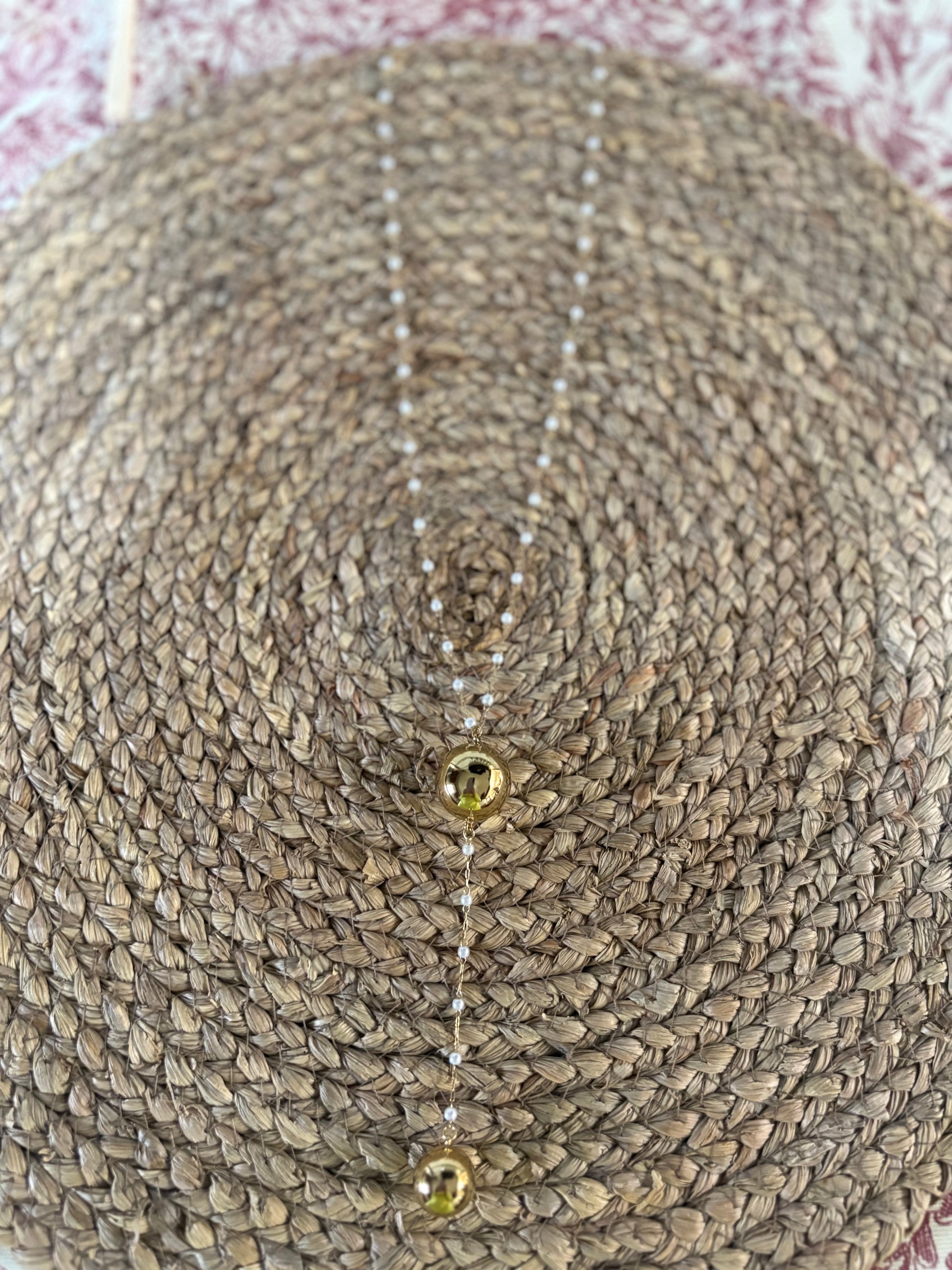 -Diseño: Cadena delgada adornada con pequeñas perlas, con cierre de estilo lariat que termina en dos colgantes de bola dorada.