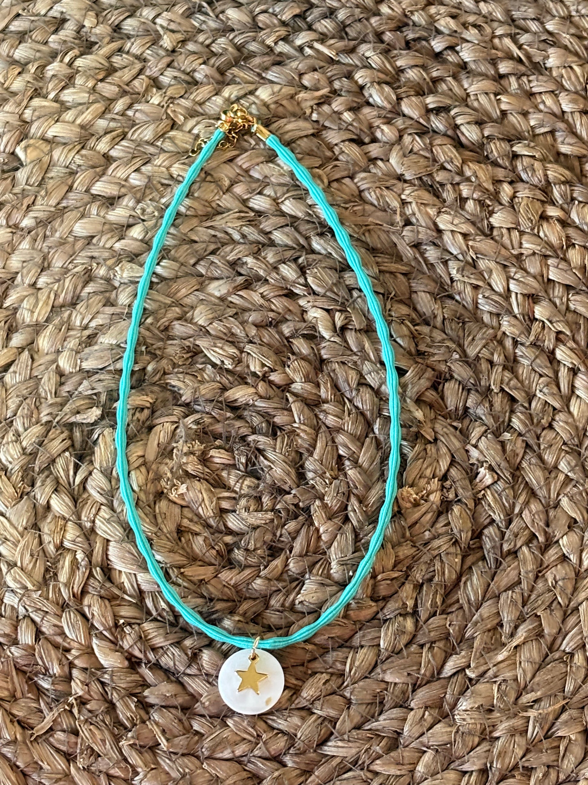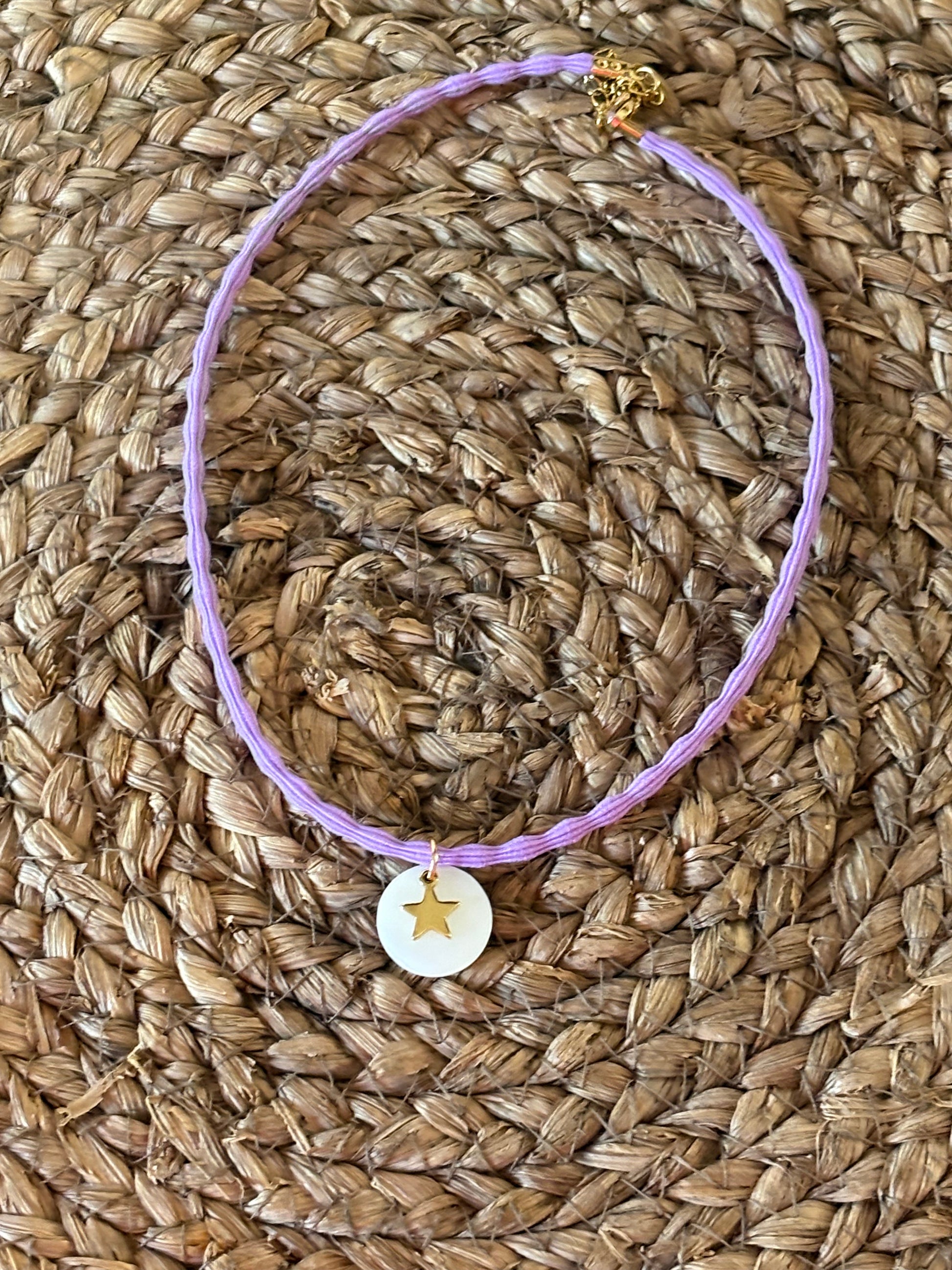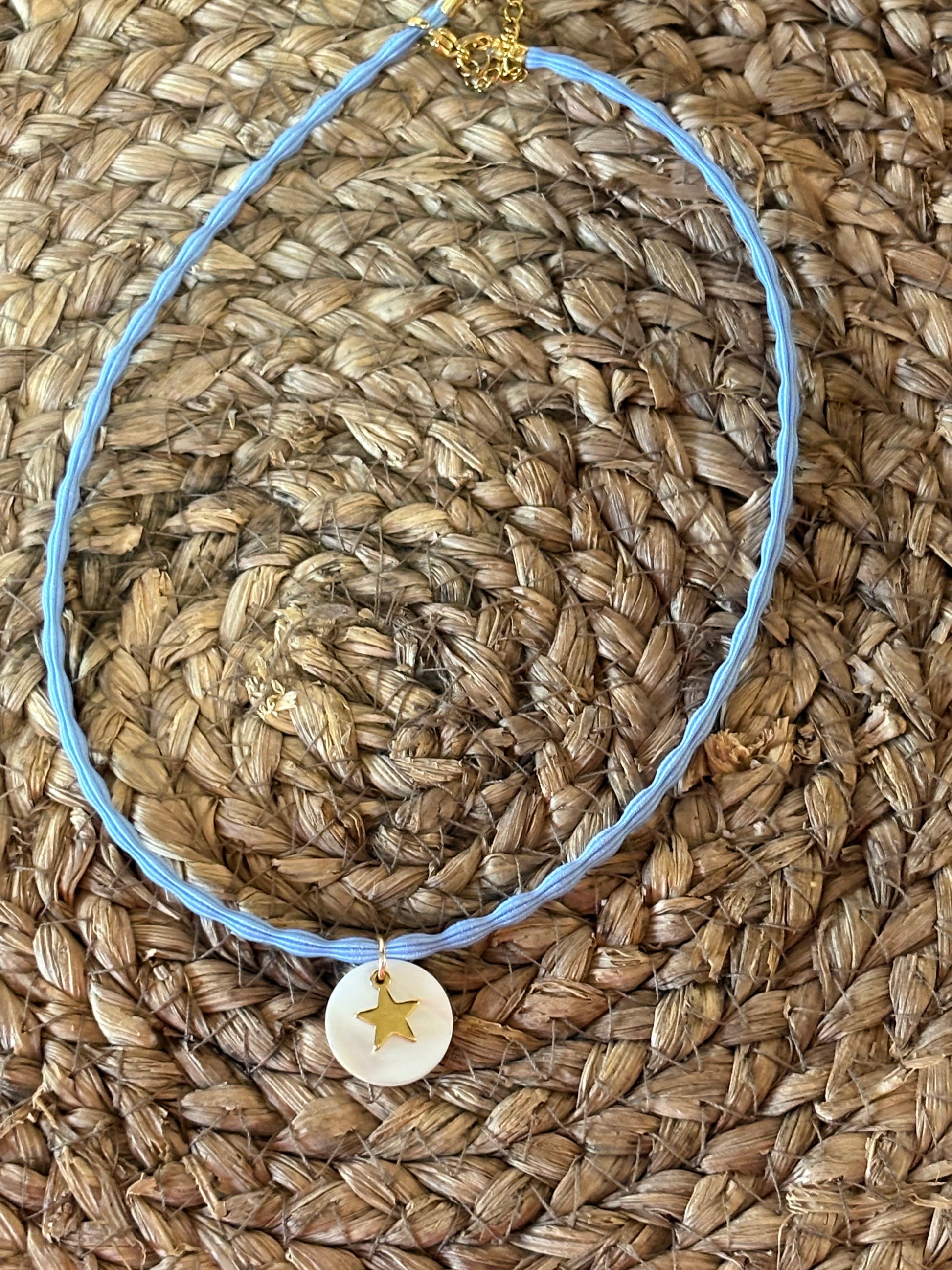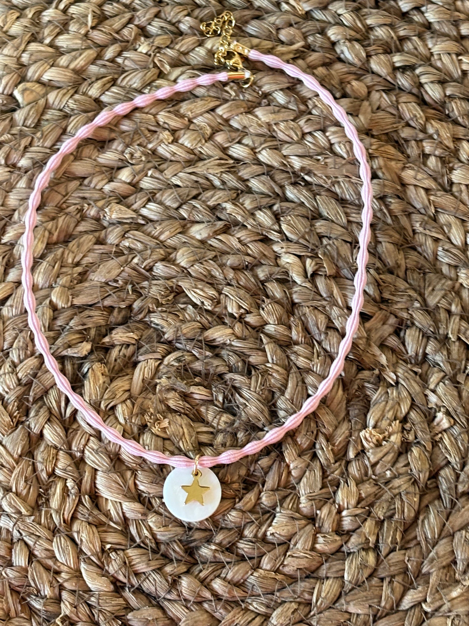 Collar de estilo minimalista compuesto por un cordón trenzado disponible en seis colores: celeste, rosa, verde, nude, púrpura y malva. Lleva una medalla circular de nácar con una pequeña estrella dorada en el centro. Incluye cierre metálico dorado con cadena ajustable que permite adaptarlo a la medida deseada. Un complemento sencillo y versátil, pensado para aportar un toque delicado al look.