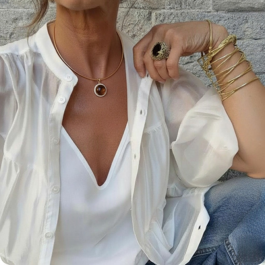 Esta gargantilla rígida destaca por su diseño limpio y elegante, realzado por un colgante circular central con detalle decorativo que aporta carácter y equilibrio a la pieza. Su estructura minimalista la convierte en un complemento versátil, ideal tanto para looks diarios como para estilismos más especiales. Es una gargantilla pensada para lucirse sola, aportando un toque refinado y favorecedor al cuello y al escote.