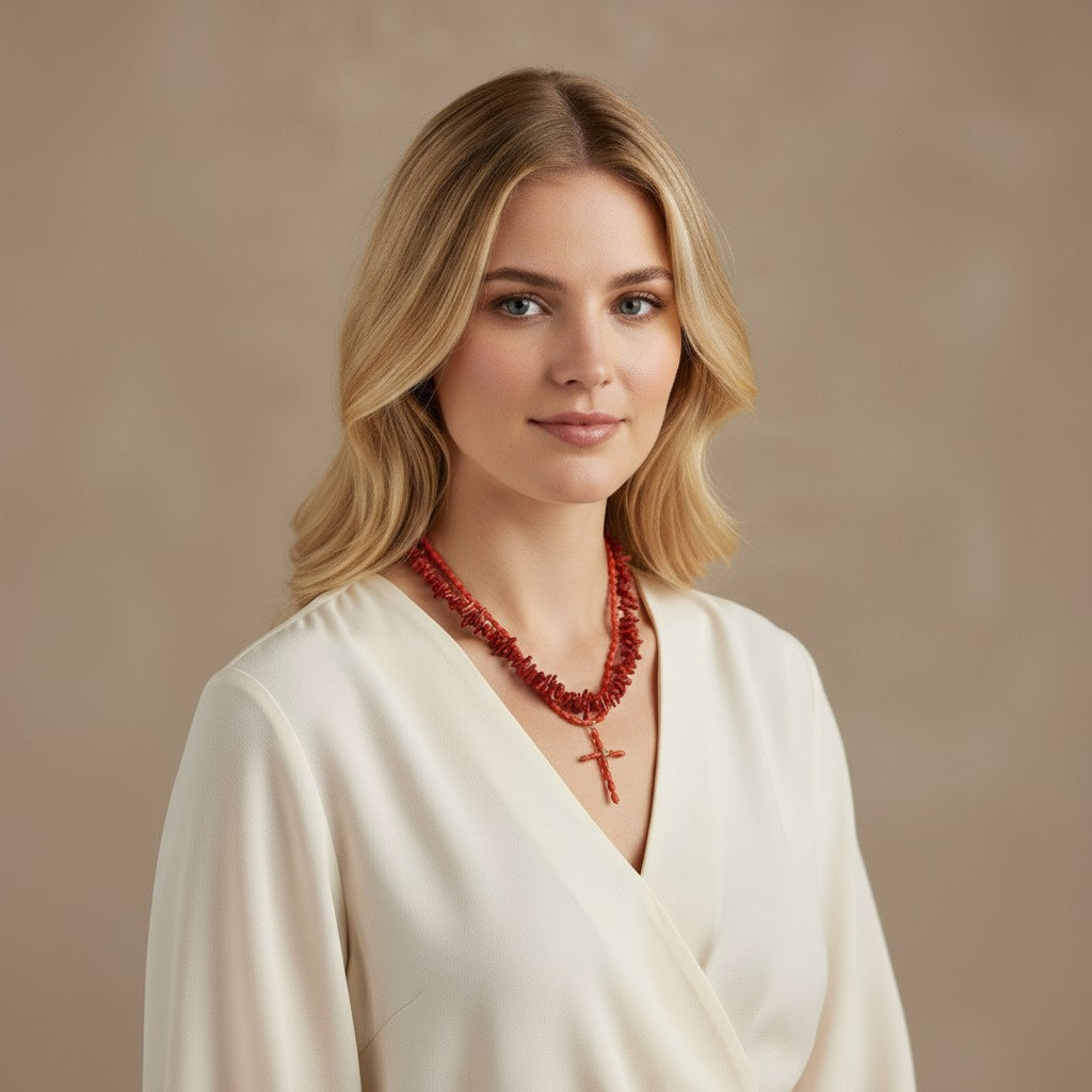 Collar de coral rojo natural con cuentas ovaladas pulidas que aportan elegancia y color. Ideal para combinar con prendas neutras o vestidos de verano.