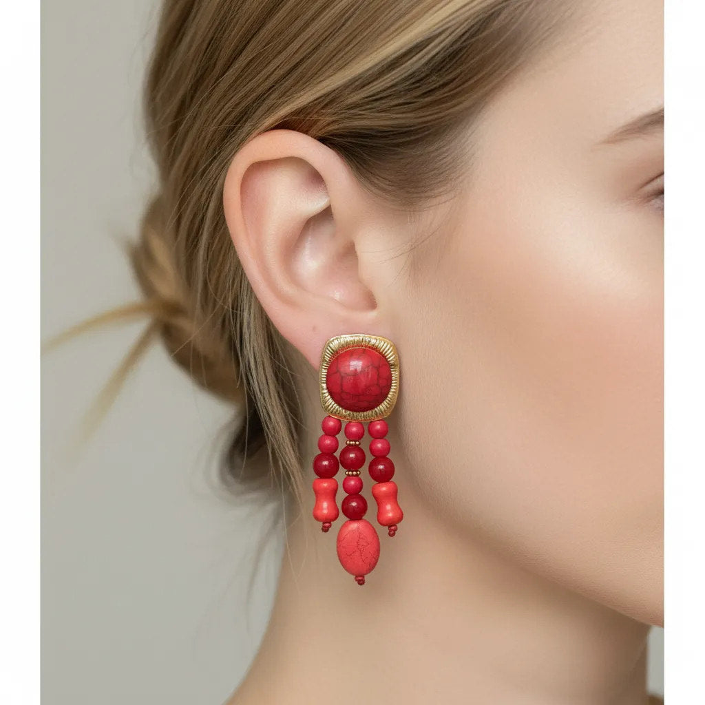 Cada par presenta un gran cabujón cuadrado enmarcado en metal dorado texturizado, del que cuelgan tres delicadas hebras de cuentas de diferentes tamaños y formas. Elige el color perfecto para tu ocasión:
