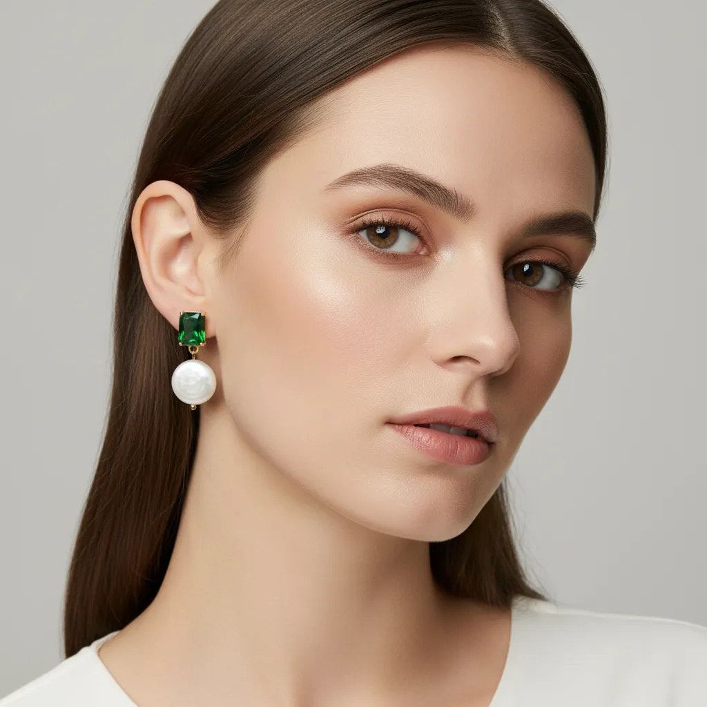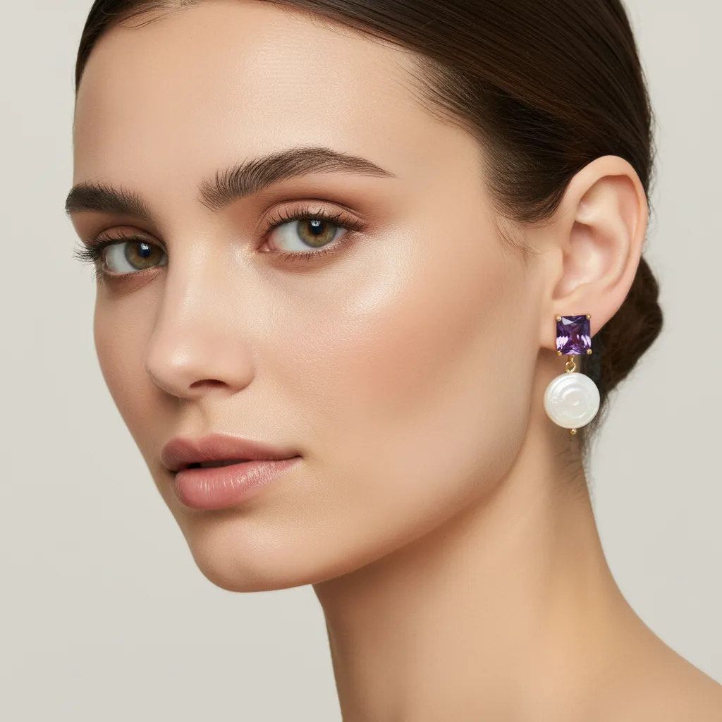Elegantes y sofisticados, estos pendientes combinan una piedra facetada superior —disponible en verde esmeralda o malva amatista— con un precioso colgante de concha blanca natural.